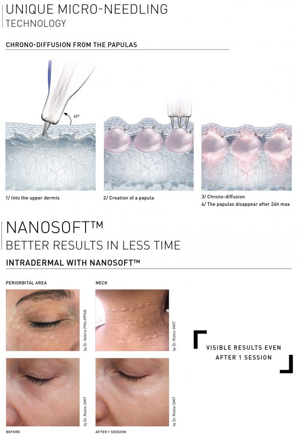 Results from multiple controlled clinical studies have shown that the application of mesotherapy after collagen induction therapy containing growth factors: - Reduces the appearance of fine lines and wrinkles as a result of new collagen synthesis